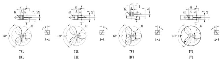 75、三葉左旋導(dǎo)流筒推進式TVL 76、三葉右旋推進式TXR