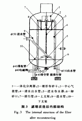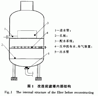 污水站采用的過(guò)濾裝置為普通平流濾塔(高4 m,直徑2.3 In),改造前濾塔內(nèi)部結(jié)構(gòu)見(jiàn)圖1。該濾塔采用雙層濾料,上層為石英砂,下層為水淬渣,反沖洗方式采用大阻力配水系統(tǒng)氣水聯(lián)合反沖洗。平流濾塔存在的問(wèn)題:①反沖洗采用大阻力配水系統(tǒng),每天反沖洗15n1in,消耗大量水資源和電能;② 在傳統(tǒng)的常壓反沖洗系統(tǒng)中,存在著反沖洗不徹底、濾料需要定期更換的問(wèn)題。