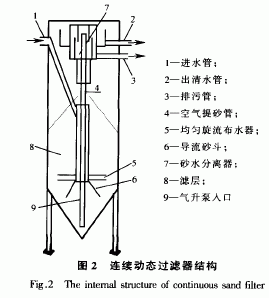 “連續(xù)過(guò)濾”(continuous sand filter)是近年來(lái)國(guó)外研制成功的一種新型過(guò)濾技術(shù),在此基礎(chǔ)上,各國(guó)公司分別開(kāi)發(fā)了新型的一體化水處理過(guò)濾設(shè)備。挪威Nordic Water公司的Dynasand,在過(guò)濾器中完成混合、混凝、過(guò)濾和反沖洗,連續(xù)過(guò)濾、連續(xù)反沖洗,無(wú)需反沖洗泵和反沖洗水箱,是一種高效節(jié)能的水處理設(shè)備。