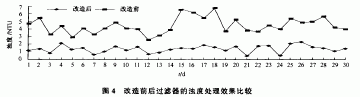 改造后過(guò)濾器和未改造過(guò)濾器運(yùn)行30 d的出水濁度數(shù)據(jù)見(jiàn)圖4。