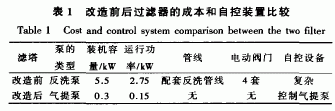 由表1可見(jiàn),改造后的連續(xù)動(dòng)態(tài)過(guò)濾器與改造前的普通過(guò)濾器相比,其裝機(jī)容量大幅降低,折合到24 h進(jìn)行比較,其運(yùn)行功率減少了50%,反沖洗自控裝置簡(jiǎn)化。因此連續(xù)動(dòng)態(tài)過(guò)濾器的設(shè)備成本和運(yùn)行成本均優(yōu)于普通過(guò)濾器,而且操作簡(jiǎn)單,運(yùn)行安全。